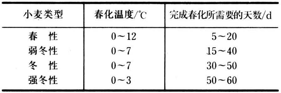 根据春化阶段时间长短和所需的低温强度,可将小麦分为冬性、春性等类型,见表。