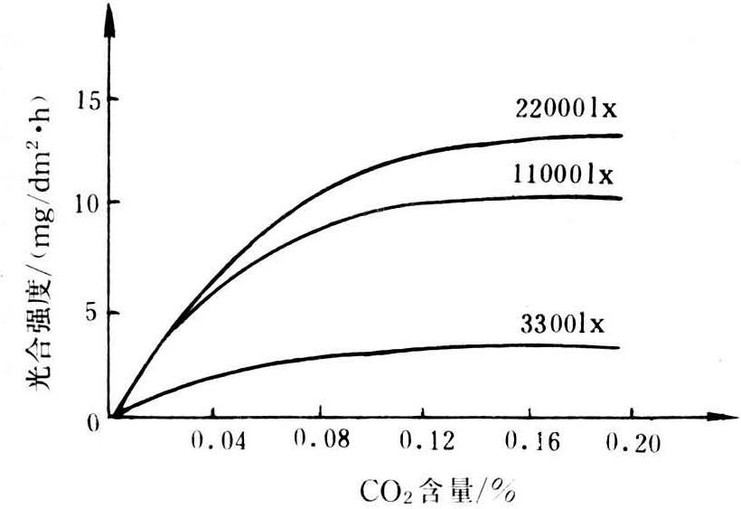在辐射能充分满足的条件下,作物的光合作用强度不再随CO2浓度的增加而增大时的CO2浓度。大多数作物的CO2饱和点在800~1800μl/L左右。正常大气中CO2浓度在CO2饱和点以下。农田里,尤其是晴朗无风的白天,株间CO2浓度经常成为光合作用的限制因子。提高CO2浓度,大多数作物都有增产效应。据报道,把作物放在1 0 00μl/L C O 2浓度时