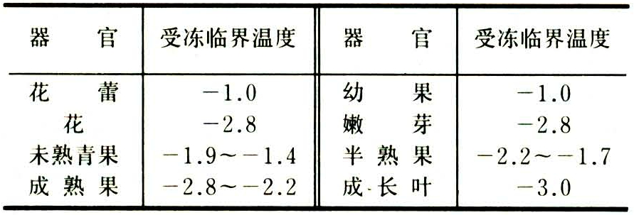 柑桔的花蕾和幼果最不耐寒,叶片新梢次之。衰老树、病虫树、幼年树耐寒性弱,见表。