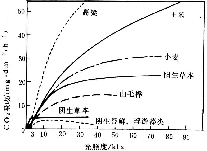 图2 在适宜温度和正常的CO2供应下,各种植物净光合作用的曲线