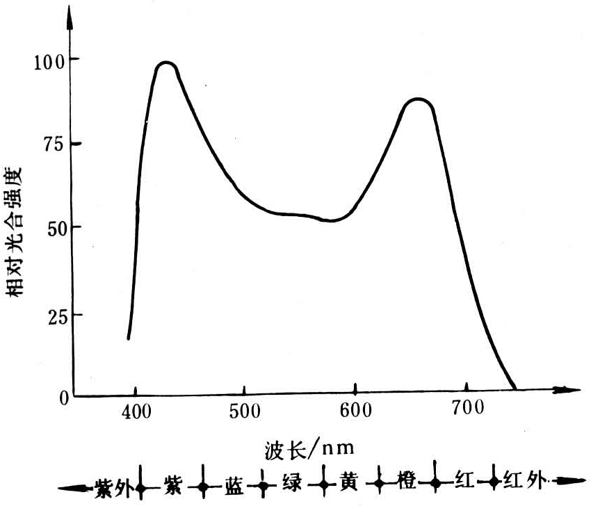 各种植物的光合强度随光照度不同而变化的趋势是近似的(图2),在光照度较低的时候,植物的光合强度随光照度近于正б变动;当光照度提高时,光合强度的增加幅度就逐渐减慢,在强光下趋向于恒定。在不同光质下植物的光合强度有明显差异,能量相等的不同颜色光下的光合作用以红光和蓝紫光较高,黄绿光较低(图3)。植物水分亏缺时,能使光合强度显著降低。