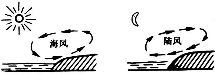 在沿海地区发生的昼夜间有风向转换现象的风。一般日间吹海风,夜间吹陆风,总称海陆风,是一种局地环流。昼间地表受热后,陆地增温б海面快,出现由海洋指向陆地的气压梯度,在下层形成由海洋吹向陆地的海风,入夜后,陆地表面辐射冷却,使陆面气温低于海面,出现与日间相反的热力环流,下层风由陆地吹向海洋,形成陆风,见图。海陆风现象在夏季晴朗日子最容易观测到,一般在上午出现海风,13~15时海风最盛,日落后海风减弱,并转为陆风。海风风力一般比陆风强,可达5~6米/秒或更大,陆风一般只有1~2米/秒。海风在低纬地区厚度可达1公里左右,水平范围50~100公里;在中纬度厚度约几百米,水平范围为几公里至几十公里。陆风的厚度比海风小得多。由于海陆风影响,使得沿海地区夏季不十分炎热。凡在地表受热不均的地方,如大湖沿岸,森林内外,城市与郊区之间都可观测到类似于海陆风的局地风状况。研究沿海地区的海陆风(或大湖沿岸的湖陆风)状况,对在这些地区的厂矿建设规划、避免空气污染有指导意义。(翁笃鸣)
