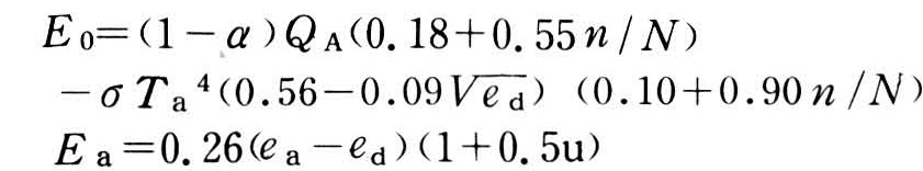 式中 α为反射率;QA为理论太阳辐射;n/N为日照百分率;σ为斯蒂芬-波尔兹曼常数;Ta为气温,用绝对温标;ea、ed单位用百帕;u为2米高处的风速,单位用米/秒(如用气象站风速须换算)。