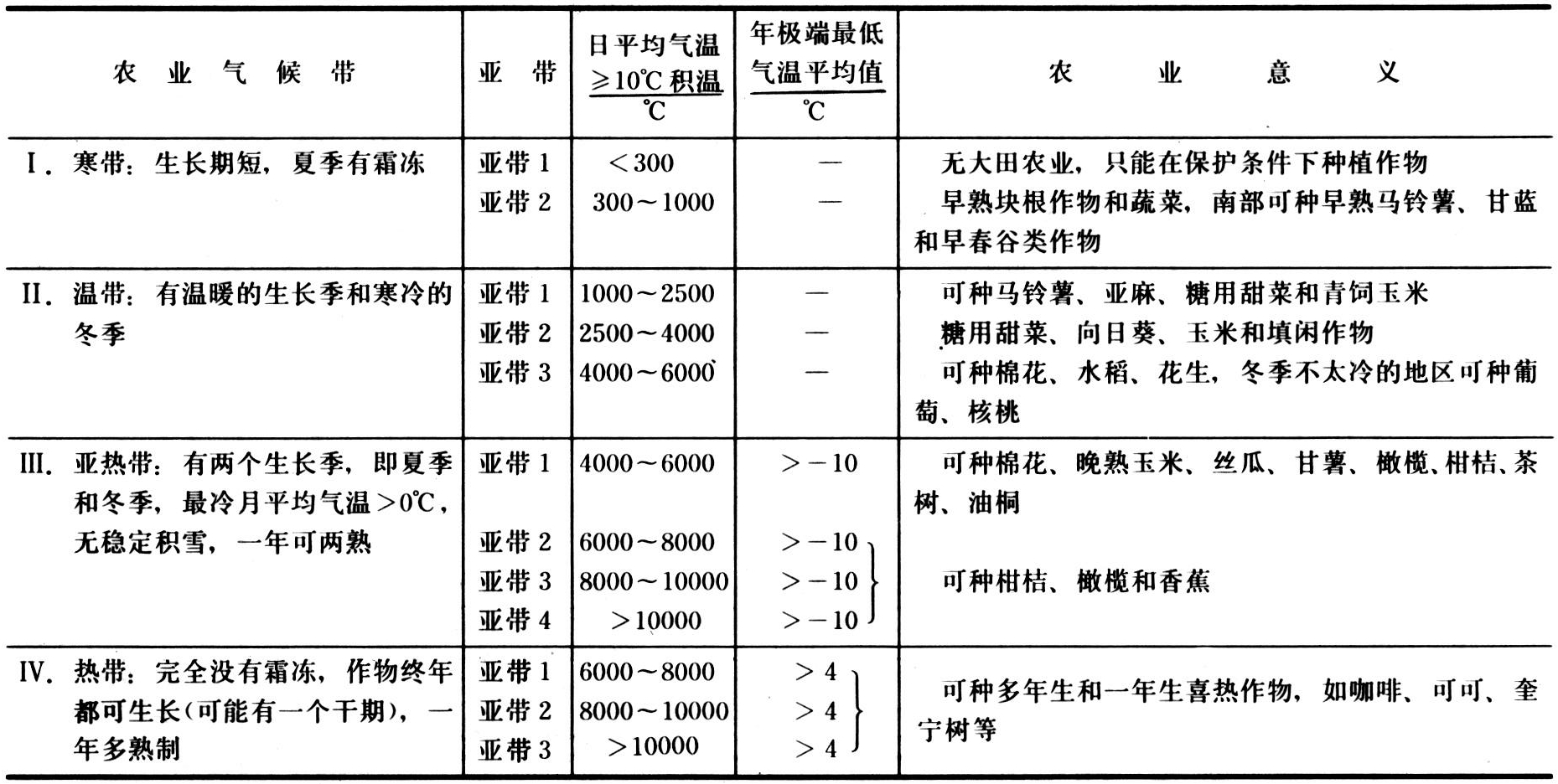 苏联Г.Т.谢良尼诺夫于1937年首先发表了关于世界农业气候区划的报告,经多次修改,1966年完成综合世界农业气候区划。И.А.戈尔茨贝格1972年将其编入《世界农业气候图集》中。此区划采用三级指标:第一级是热量(月平均气温≥10℃积温)和年极端最低气温平均值,划分出四个农业气候带:寒带、温带、亚热带和热带(见表)。第二级是水分条件,按水热系数划分四个湿润地带:水热系数<0.5为干旱地带;0.5~1.0为半干旱地带;1.0~1.5为湿润地带;>1.5为过湿润地带。此外,按夏季水热系数、干旱频率等辅助指标做了详细的划分:第三级是越冬条件,按最冷月平均气温()划出五个区;A区