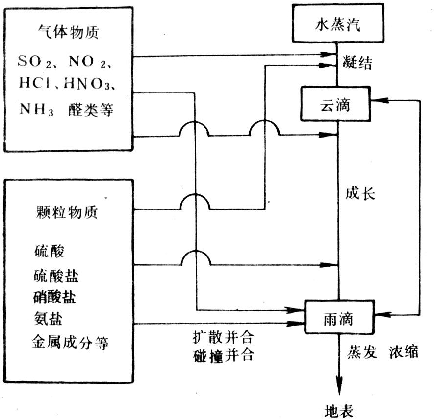 由于排入大气中的酸性污染物质增加,形成的pH值小于5.6的降水。酸雨的形成过程如图所示。 降水酸化的基本过程 酸雨是环境污染的一个突出问题,它会导致河流和湖泊的水质变酸,从而影响生态系统,当水质酸化到pH值为5时,水中各种无脊椎动物会明显减少;pH值4时,水中的鲑鱼类死亡。酸雨也可使土壤变酸,并降低土壤肥力,恶化作物生长的环境。