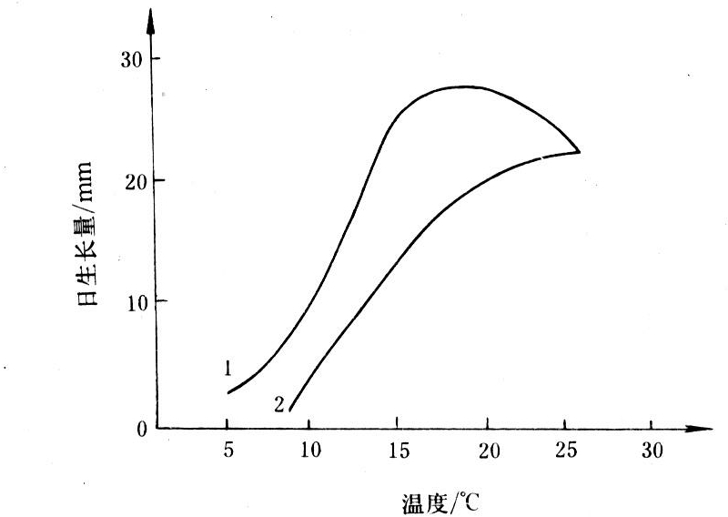 在自然条件下,植物的生长速度也有日变化,夜间和早晨生长速度最大。所以用日平均温度作为作物生育速度指标是不合适的。夜温对植物生长的重要性早已有所认识。图为番茄生长在昼夜变温下与恒温下的比较。