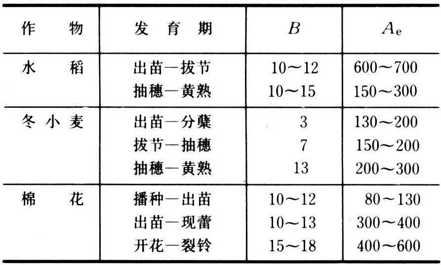 由于有效积温中不包含低于B值的温度,所以用它来表征作物生育对热量条件的要求,更为准确。与活动积温相比,有效积温变化小,且较为稳定,多应用于作物生育速度的计算和发育时期的预报。稻、麦、棉三种作物各主要发育期的Ae和B 值见表。