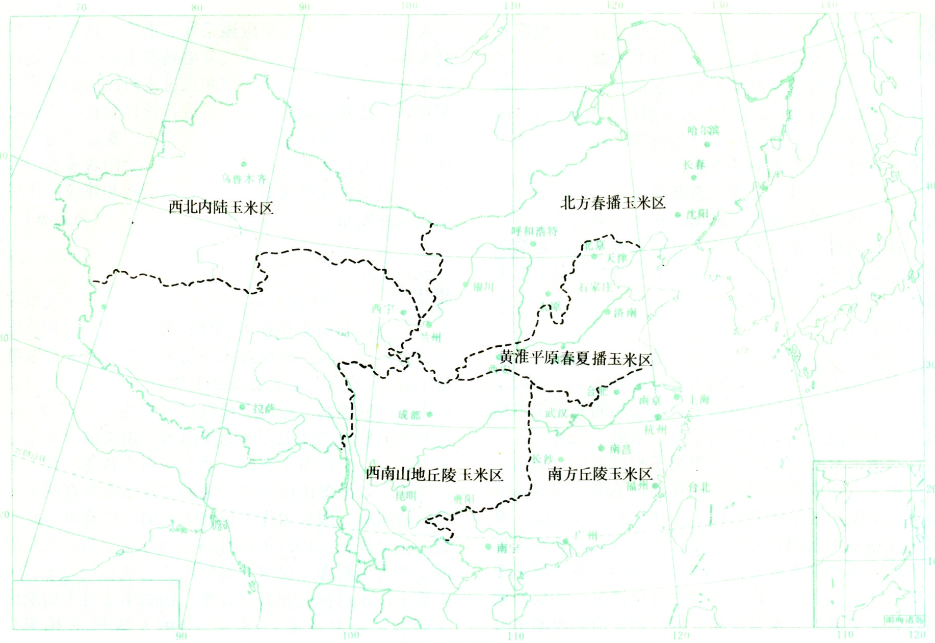 玉米气候适应性比较广泛,凡大于10℃积温在1900℃以上,夏季平均气温在18℃以上的地区均可种植。从55°N 到40°S之间,低纬度海拔高度达3636米,都可种植玉米。中国南起海南岛崖县(18°N),北至黑龙江省的黑河(50°N),东至台湾西至新疆的喀什地区以及西藏(西藏东南的察隅、墨脱等地)均有玉米种植。根据自然条件及种植制度的地域差异,全国可分五个气候特征不同的产区(图1):①北方春播玉米区。日平均气温10℃以上的日数120~170天。夏季平均气温在20℃以上,大于10℃积温在2000~3600℃之间,年降水量500毫米左右,为一年一熟春玉米区。本区除春旱外,夏季雨水较多,温度适宜,日照充足,有利于玉米高产。②黄淮平原春、夏播玉米区。是中国种植玉米面积最大的区域。大于10℃日数为200~240天左右,大于10℃积温在4000~4600℃左右,年降水量400~900毫米,主要集中在夏季。因降水季节分配不均匀,有春旱、夏涝及秋旱现象。日照充足,年日照时数为2400~2800小时左右,以一年二熟的夏玉米为主要形式。北部尚有二年三熟的春、夏玉米种植。③西南山地丘陵玉米区。4~10月平均气温均在15℃以上,10℃以上日数250天以上,高山区150天以上。年降水量在1000毫米以上,分布均匀。玉米主要分布在山区、丘陵地。④南方丘陵玉米区。3~10月平均气温在20℃以上,10℃以上日数250天以上,年降水量一般在1000毫米以上,夏涝秋旱。以秋播玉米较多。海南岛部分地区有冬播玉米。⑤西北内陆灌溉玉米区。本区生育期125~180天。大于10℃积温大部地区在2000~4000℃之间。年降水量不足150~300毫米,干旱少雨。主要以一年一熟春玉米为主。另外,西藏东南海拔较低的温暖河谷地区以及青海东部农业区部分地区(如民和、循化、贵德、西宁等地),5~9月平均气温10℃以上,10℃以上日数120~140天以上,大于10℃积温1900℃以上,为一年一熟的早熟或极早熟春玉米区。