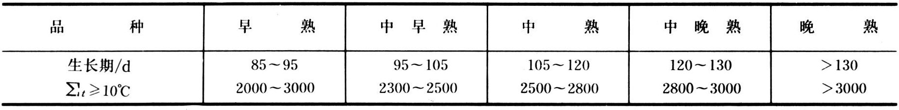 玉米为喜温作物,生育期间生物学零度为10℃。种子在6~7℃开始发芽,但极缓慢,并易感菌霉烂。10~12℃发芽正常。最适发芽温度为25~28℃。种子由播种到出苗的间隔时间与温度关系密切,10~12℃需18~20天出苗,15~18℃需8~10天出苗,大于20℃5~6天即可出苗。玉米在18℃以上幼苗生长较快,30~32℃时最快。抽穗开花时期适宜温度为25~28℃,气温低于18℃或高于38℃不开花,当气温高于30℃,空气湿度小于60%开花甚少,气温高于32℃(有的品种在35℃以上)花粉粒1~2小时即丧失生活力。在籽粒灌浆、成熟时期要求日平均温度保持在20~24℃,有利于有机物质合成和向果穗子粒运转。籽粒成熟期日平均气温超过25℃或低于16℃均影响酶活动,不利养分积累和运转,日平均气温13℃左右玉米灌浆仍可很缓慢进行。成熟后期遇-3℃低温,易使含水量高的子粒丧失发芽力。夏玉米出现叶片数与其间积温有极显著的幂函数关系,在籽粒灌浆过程中,子粒增重与积温呈指数曲线关系。全生育期间平均气温在20℃以下时,每降低0.5℃,玉米达到成熟时生育期要延长10~20天。中国玉米品种对热量的要求见表1。同一品种玉米套种后,其生育期比平作玉米要长3~6天,所需积温相应约多50~100℃。