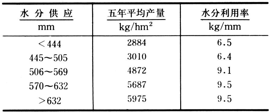 在干旱条件下,玉米适时灌水可加快发育速度,有利于物质向生殖器官运输,加速子粒灌浆过程,可提早5~6天成熟。产量亦随水分供应量增加而提高,水分利用率也随之提高(表2)。