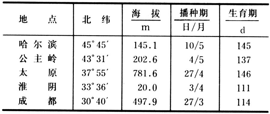玉米感温性强,感光性较弱,只要满足生育期对水热的要求,一般可以在不同地区生长,同一品种可春播或夏播。但南方培育的品种感光性强于北方品种,其生育期受温度和日照的双重影响,而北方培育的品种,对日照反应不敏感,生育期主要受温度的影响。因此,由低海拔向高海拔,由南向北引种,生育期延长;反之,生育期缩短(表3)。通常,北方培育的品种南引效果好,南方的品种北引常因低温和长日影响,延迟发育,雌雄花期不遇,造成空秆多,果穗小,产量低。