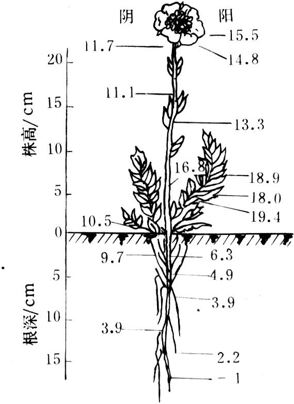 植物体各部分以叶片对温度最敏感。叶温主要受辐射、风速及蒸腾的影响。太阳辐射照射到叶面后,主要消耗于叶面的反射、透射、乱流热交换与蒸腾,这几个因子和叶温与气温的差值呈函数关系。在太阳辐射下,叶温常高于气温,一般高3~5℃,有时甚至高出10℃以上,阴天或荫蔽时,叶温与气温接近,图为气温11.7℃时,植物的阳面和阴面,地上部和地下部各部位的温度。在夜间,叶温比气温低。叶片内含水量、叶片厚度、叶片大小、色泽及叶角大小等都会影响到叶温的高低。