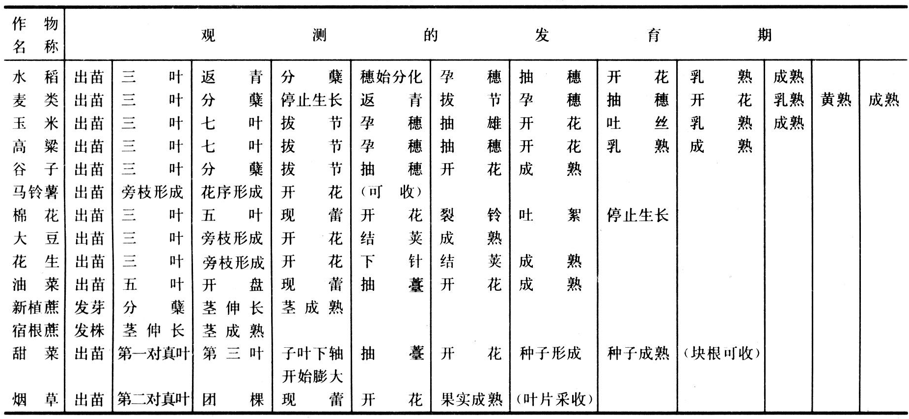 随作物种类不同而异。如谷类作物(麦类、水稻、玉米等),一般观测出苗、三叶、分蘖、拔节、孕穗、抽穗、开花、乳熟、黄熟、成熟等(见表)。观测这些发育期有生物学意义:如出苗期是谷类作物自胚萌动至幼苗期处于感温阶段,须满足一定温度条件后才能通过;第三叶出现,标志种子胚乳中营养物耗尽,开始从外界吸取营养;分蘖期是重要的发育阶段,分蘖的时间、数量与当时的土壤营养条件、土壤湿度和环境温度等有着密切关系,对培育壮苗和控制合理的群体结构有重要意义,是决定穗数、获得高产的重要时期;拔节是作物由营养生长转入生殖生长的时期,对肥水的要求日益严格;孕穗至抽穗是决定粒数的时期,也是对光、温、水反应的敏感期;开花期是作物由于各种环境原因能否结实的时期;乳熟期是籽粒形成的重要阶段;黄熟期植株体内营养向谷粒中的输送基本停止;由乳熟至黄熟,是决定千粒重的关键时期,这时期如温度急剧升高或急剧降低至灌浆临界温度以上或以下,都将使千粒重降低。