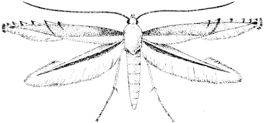 在柑橘新梢嫩叶表皮下蛀食为害的害虫之一。又名橘潜蛾。学名Phyllocnistis citrella Stainton。鳞翅目,叶潜蛾科。分布于亚洲,非洲和大洋洲。幼虫主要为害柑橘类植物,受害叶严重卷曲,入冬常大量落叶,影响柑橘树冠的扩大。叶片被咬食的伤口,常诱致溃疡病蔓延。苗木幼树受害严重。以夏秋季抽梢期发生最盛。冬、春梢受害很轻。成虫银白色,体长2毫米,翅展4毫米左右,触角呈丝状,前翅为披针形,翅基部有两条黑褐色纵纹,长约及翅之半,翅近中部具“Y”形黑褐色斜纹。前缘中部至外缘有橘黄色缘毛,顶角有一黑色圆斑。后翅呈针叶形,缘毛长(见图)。卵白色透明,椭圆形,底平,弧圆形隆起,表面光滑。幼虫黄绿色,扁平无足,头三角形。第三龄幼虫体长3~4毫米,腹部末端有一对细长的尾状物。蛹黄褐色,纺锤形,长约2.5毫米,头顶有倒“Y”形穿茧器,蛹体外有黄褐色薄茧。