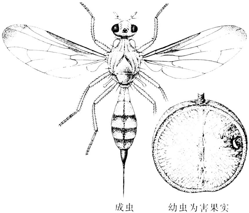 蛀害柑橘果实的蝇类害虫。幼虫在果内取食为害,常使果实未熟先黄脱落,严重影响产量和品质,也是国内外重要的检疫对象。中国常见的有柑橘大实蝇,蜜柑大实蝇和柑橘小实蝇。柑橘大实蝇学名Tetradacus citri(Chen)。分布于中国四川、云南,贵州、广西、湖南、湖北、陕西等省区。寄主植物仅限于柑橘类,主要为害甜橙,酸橙、柚子、红橘、温州蜜柑、柠檬、香橼,佛手等,其中以甜橙受害最重。