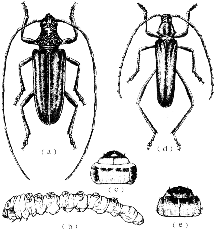 学名Nadezhdiella cantori(Hope)。分布于泰国及中国(长江流域以南各省区和山东,河南及陕西)。寄主植物为柑橘类。成虫体长26~51毫米,黑褐色,被灰黄色短绒毛。头顶两复眼间有一深纵沟。触角基瘤隆起。雄虫触角超过体长1/2~2/3,雌虫触角较体略短。前胸宽大于长,背面有不规则致密的皱褶。卵椭圆形,乳白色,表面有网纹及细刺状突起。末龄幼虫体长46~56毫米,乳白色。前胸背板有横列4块棕色宽带,位于中央的两块较长,两侧者较短。胸足细小。中胸的腹面,后胸及腹部第一至七节背、腹两面均具移动器(见图)。蛹淡黄色。