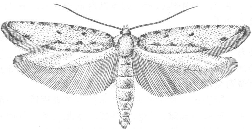 雌成虫体长5.0~6.2毫米,雄体长5.0~5.6毫米;灰褐色,稍带银灰光泽。触角丝状。下唇须3节,向上弯曲超过头顶,第一节短小,第二节下方被覆疏松、较宽的鳞片,第三节长度接近第二节,但尖细。前翅狭长,鳞片黄褐色。雌虫翅臀区鳞片黑色如斑纹。雄虫翅臀区无此黑斑,有4个黑褐色鳞片组成的斑点;后翅前缘基部具有一束长毛,翅缰一根。雌虫翅缰3根。雄虫腹部外表可见8节,第七节前缘两侧背方各生一丛黄白色的长毛,毛丛尖端向内弯曲(见图)。卵椭圆形,微透明,长0.5毫米,初产时乳白色,孵化前变黑褐色。空腹幼虫体乳黄色,为害叶片后呈绿色。末龄幼虫体长11~13毫米,头部棕褐色,每侧各有单眼6个,胸节微红,前胸背板及胸足黑褐色,臀板淡黄。腹足趾钩双序环形,臀足趾钩双序弧形。蛹棕色,长6~7毫米,宽1.2~2.0毫米,臀棘短小而尖,向上弯曲,周围有刚毛8根,生殖孔为一细纵缝,雌虫位于第八腹节,雄虫位于第九腹节。蛹茧灰白色,长约10毫米。