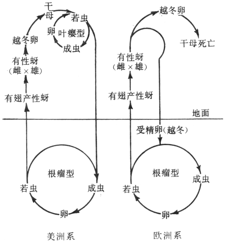 只有在美洲野生葡萄、美洲系葡萄品种或用美洲系葡萄作砧木的欧洲系葡萄品种上才有完整的发育循环;在欧洲系品种上生活周期不完整,只有根瘤型,而无叶瘿型(图2)。根瘤型每年发生5~8代,叶瘿型7~8代,主要以根瘤型成虫在较深根际越冬,间或以有性蚜交配产卵越冬。平时,主要以孤雌生殖产无性卵,仅在秋末才行两性生殖。若虫和有性蚜借风力、雨水和水流等传播,有翅成虫在产卵飞翔时借风力传播,苗木、插条、砧木、尤其是带根的成苗是远距离传播的主要途径。此虫适于山地粘壤土,沙土地对其生长不利。沙土地育苗是防治方法之一,抗虫育种也是一种有效的防治方法。药剂防治可用六氯丁二烯处理土壤,有效期3年以上,此药还能刺激根、叶生长,对土壤养分及有益生物群落无不良影响,在葡萄果中无残毒。