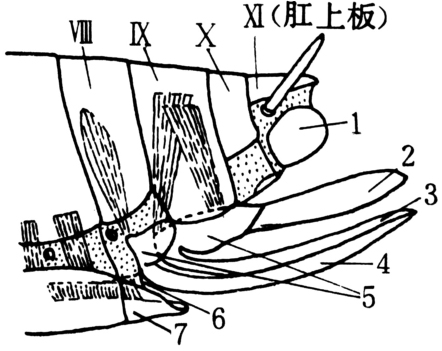 一般指产卵器,由第八、九腹节的生殖肢形成;生殖孔位于第八、九节间的节间膜上。缨尾目最简单,蜻蜓目、直翅目、半翅目及膜翅目的产卵器极发达,且高度骨化。产卵器有剑状、管状、针状及栓状等,适于划破寄主组织或挖开土壤后产卵。产卵器包括3对产卵瓣(图1),瓣基部为负瓣片。发生在第八腹节上的为第一产卵瓣,即产卵器的腹瓣,基部骨片称第一负瓣片;第九腹节的产卵瓣为第二产卵瓣,又称为背瓣,基部骨片为第二负瓣片(见图2)。在第二负瓣片上常另向后伸出一个瓣状的外长物,为第三产卵瓣,或称为内瓣(见图2)。背瓣通常形成产卵器的鞘。直翅目蟋蟀科、蝗科产卵器由背瓣和腹瓣组成,内瓣位于背瓣基部,极不发达。膜翅目有刺类的产卵器已无产卵功能,腹瓣转化为螫针。无真正由附肢形成产卵器的昆虫,如缨翅目管尾亚目(Tubulifera)、长翅目、鳞翅目、鞘翅目、双翅目等,以腹部末端延长成细管,亦称外生殖器(即产卵管)(图2)。