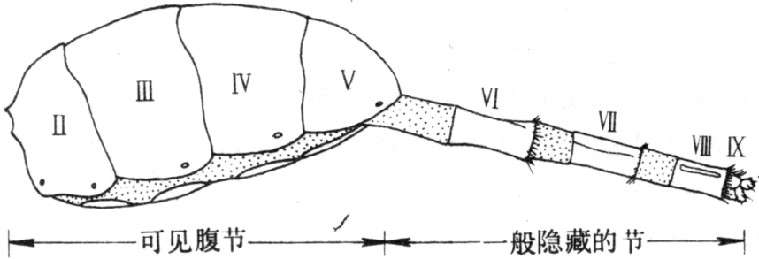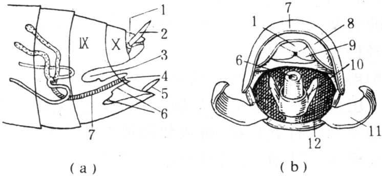 包括将精子输入雌体的阳具及交配时挟持雌体的一对抱器(clasper或havpagon),一般发生在第九或第十腹节(图3)。