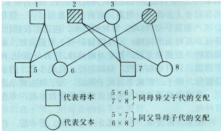 同父异母或同母异父的子代中雌雄个体间的交配。因交配双方有一个共同的亲本,故又称半兄妹交配(见图1)。半同胞交配是近亲繁殖的一种形式,与同胞交配均属同代近交。在一个杂合群体中,如果累代进行半同胞交配,将导致生活力的减退,基因趋向纯合化,并将出现性状的分离。与自花授粉及同胞交配相比,由于半同胞交配的亲本间亲缘关系相对较远,由此引起的遗传纯合化要相对缓慢和轻微。