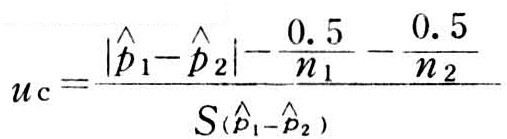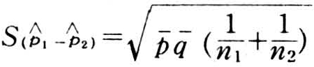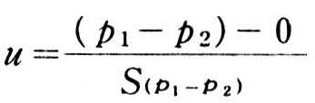 以两个成数比较的假设测验为例,双尾测验时,H0∶p1=p2,HA∶p1p2;单尾测验时,H0∶p1≥p2,HA∶p1=p2;或H0∶p1≤p2,HA∶p1>p2。其中p1、p2分别为两个样本所属总体的成数。两个成数差数的标准误可按下式计算: