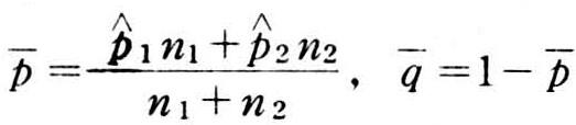 式中 n1、n2分别为两个样本的容量,而分别为两个样本具有和不具有某一属性的成数加权算术平均数,即: