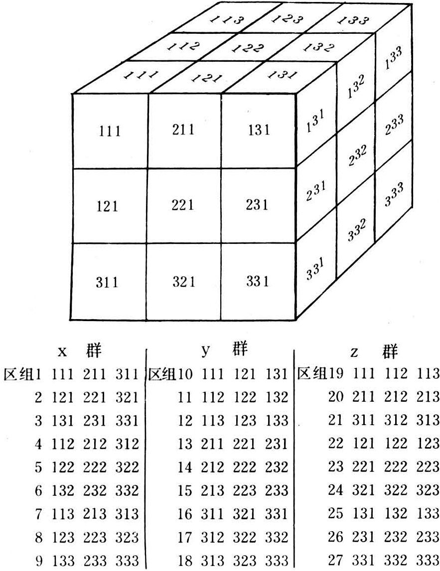 处理数k为区组所含处理数p的立方,即k=p3。例如27个处理的试验,每区组应包含p=3个处理。设计时写出x、y及z三个群,每群分三区组,每区组有3个处理,全试验共有3×32=27个区组。这可从图3立方体的纵、横和高三个方向各等分为三个部分而得。
