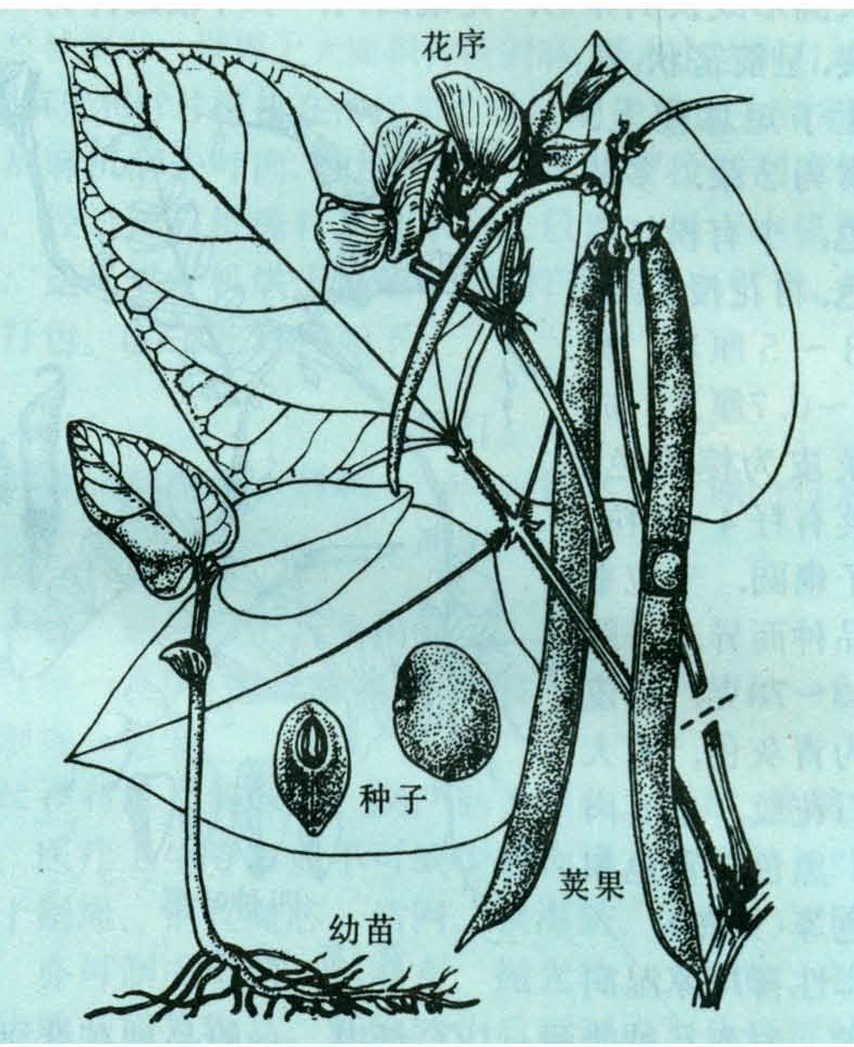 主根强大,支根多,入土深,分布于距地表20~25厘米的土层内。茎匍匐或缠绕或直立,茎上有纵线条纹。三出复叶、互生。小叶卵形或菱卵形,叶柄长而无毛,总状花序,腋生,每一花梗上着生2~4朵花,多结两荚,左右对生,花较大,白或紫色。花梗基部有3片苞叶。荚长圆筒形,稍弯曲。嫩荚绿色,成熟荚黄、褐或紫色,每荚含种子6~16粒。百粒重5~30克。粒色有白、黄(橙)、红、紫、黑及各种花斑或花纹;种脐白色,脐环明显。