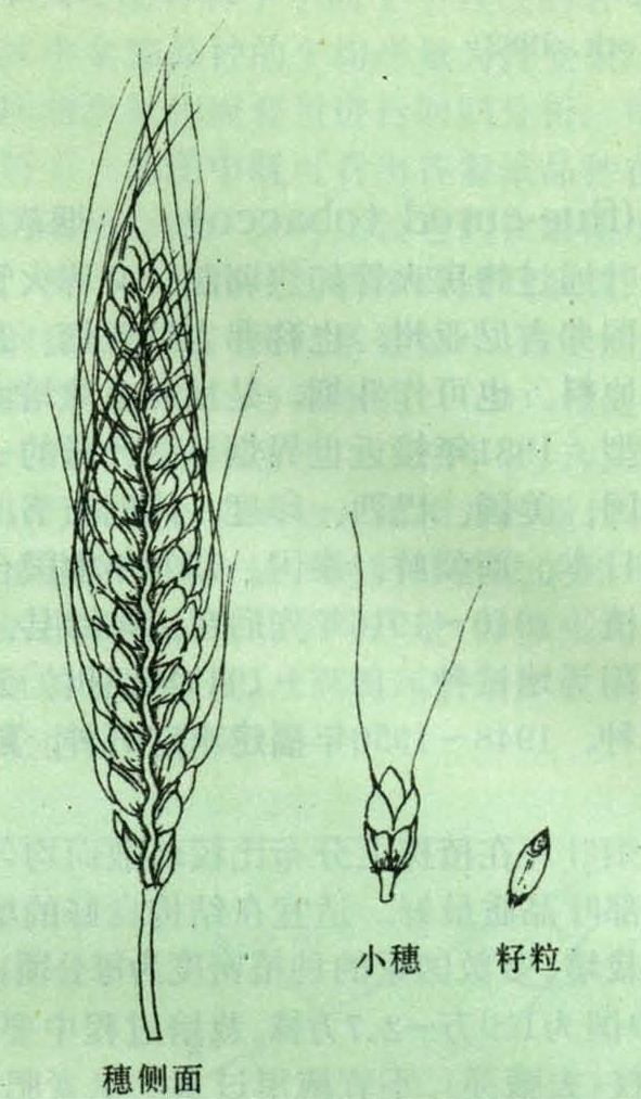 幼苗匍匐,分蘖多。穗长7~8厘米,侧面宽于正面,每穗30~40个小穗,小穗密度D=40~50。穗轴易折断。折断方式为上节位。小穗基部及穗轴两侧有茸毛,每小穗结实2粒,护颖椭圆形,紧包小穗,成熟时难脱粒,颖脊明显。籽粒带皮(稃),椭圆形,红色,半硬质,蛋白质含量较高。冬性。春化阶段41~45天,光照阶段亦长,在14小时日照下经36~40天才能抽穗。抗条锈病、叶锈病和黑穗病,感染秆锈病,耐湿性较好。(孙雨珍)