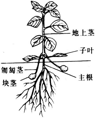 有性繁殖的实生苗只有地上茎,无地下茎。其匍匐茎由近地表叶腋处抽出伸入地下结块茎(见图3)。无性繁殖的有地上茎、地下茎、匍匐茎和块茎。地上茎是由从块茎上芽眼萌发出的枝条,其地上部分为地上茎,地下部分为地下茎。茎的横断面节处为圆形,节间为三棱或四棱形。在茎棱上生有突起的茎翅。茎翅分直翅和波状翅两种,是识别品种的特征之一。地上茎多呈绿色,也有呈紫色或褐色的。早熟品种茎高60厘米左右,分枝部位高,分枝短又少;中晚熟品种茎高80~100厘米左右,分枝部位低,分枝长。地下茎一般有6~8节,每节着生1~3条匍匐茎,其先端膨大,形成块茎。
