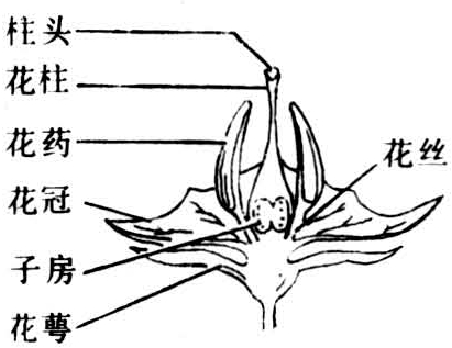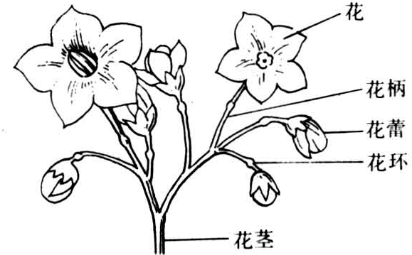 为分枝型聚伞花序,有些品种花梗分枝短缩而成简单的伞形花序。花柄细长,其上有一圈突起的环称为离层环,也称花柄节,是花果脱落处。离层环多为绿色有时呈紫色。花冠合瓣,并有星状色轮,少数品种有内重瓣或外重瓣,颜色有白、红、紫、蓝等,雄蕊5枚,雌蕊1枚(见图7、8)。