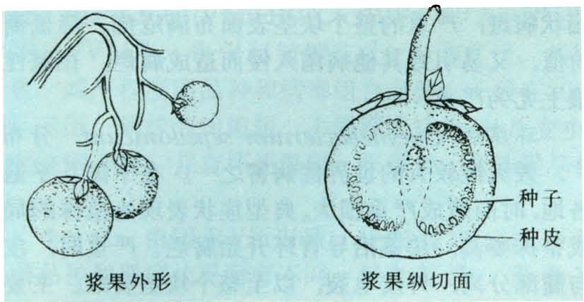浆果呈圆球形,果皮多为绿色或稍带紫色,成熟浆果淡绿色,顶部发白。子房一般2室或3室,含种子100~300粒,也有不结种子的果实。种子很小,千粒重为0.4~0.6克,呈扁平卵圆形,多为浅褐色,也有土黄色(见图9、10)。
