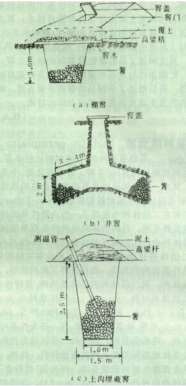 北方高寒地区多采用。从地面向下挖坑作窖,型有长方、圆筒等(见图a、b),深度均3米左右,窖口加棚盖防寒。如贮藏量大也可在窖底向四面横挖几个窖洞。须选土质紧实,地下水位低,地势高燥,背风向阳,运输管理方便之处挖窖。用后即拆除棚盖,故使用年限较短。以窖内散堆为主要形式,通常块茎堆厚1.5~2米为宜,入窖量不宜超过窖容积的2/3,每立方米块茎约重650~750千克。