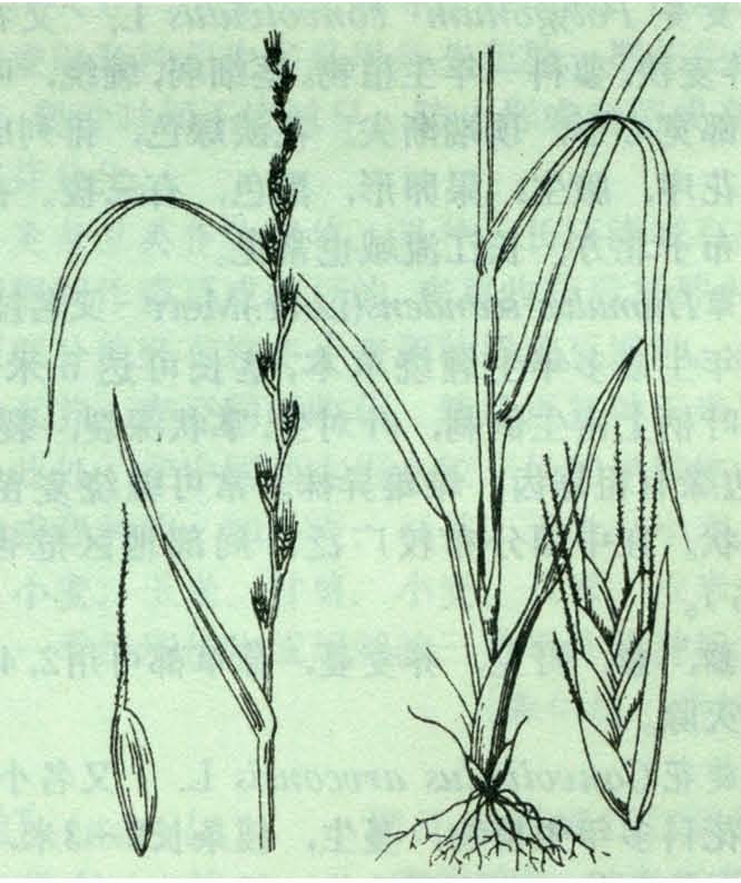 禾本科一年生植物。株高60厘米左右;穗状花序,穗长10~15厘米,穗形狭长,小麦排列稀疏,有小穗8~19个,以稃片背面对向穗轴。由于子实含有毒麦碱,可引起人和牲畜中毒。在有毒麦生长地区应重视麦种精选工作,拔除田间毒麦植株,建立无毒麦留种田,加强检疫,防止传播蔓延,播种前用60%硝酸铵选种(见图3)。