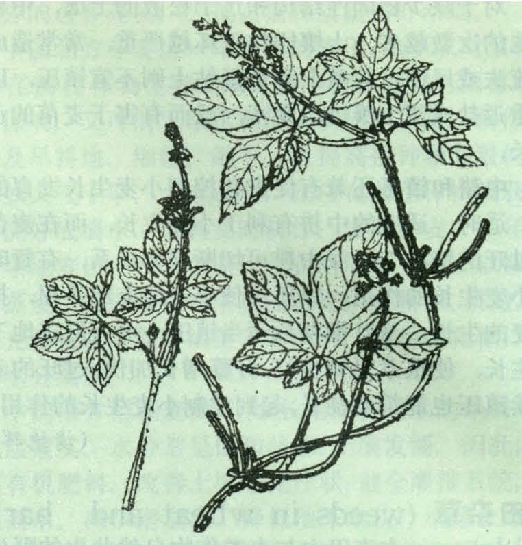 又名拉拉藤。桑科一年生或多年生缠绕草本,茎长可达5米左右。茎枝、叶柄上密生倒刺,叶对生,掌状深裂,裂片5~7片,边缘有粗锯齿,雌雄异株。常可缠绕麦苗引起成片倒状。在中国分布较广泛,局部地区危害严重(见图5)。