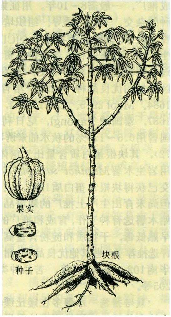 茎直立,木质,高2~5米,顶端常成三叉式分枝。单叶互生,掌状深裂,裂片5~9片,纸质,披针形。单性花,圆锥花序,顶生,雌雄同序。雌花着生于花序基部,浅黄色或带紫红色,柱头三裂,子房三室,绿色。雄花着生于花序上部,吊钟状,植后3~5个月开始开花,同序的花,雌花先开,雄花后开,相距7~10天。蒴果,矩圆形,种子褐色,光滑有斑纹。根有细根、粗根和块根。块根肉质,圆锥形或圆柱形,富含淀粉,为木薯的经济产物(见图)。