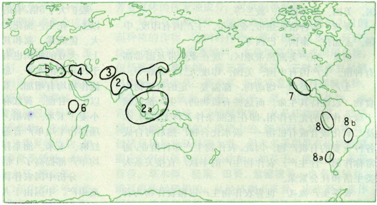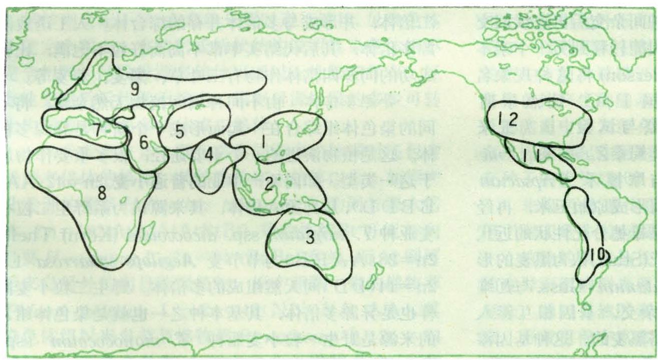 1926年,苏联的H.И.瓦维洛夫,根据所采集标本及考察研究结果,提出著名的栽培植物的八大起源中心学说(见图1)。这八大中心彼此为山丘、沙漠、海洋所隔离,农业是独立发展起来的,农具和耕作方法均不相同,每个中心都有不少种作物起源、发展,有各种变异类型,显示出起源植物的丰富多样性。以后,经过人们的进一步研究,补充和发展了瓦维洛夫的观点。1970年Л.М.茹科夫斯基《Жуковский)提出了大基因中心的学说,即将全世界作物的变异中心地区,划分为12个大基因中心(见图2)。不仅增加了起源中心地点,而且扩大了中心的范围。这12个中心几乎包括了世界所有的陆地。1982年M.E.齐文(Zewen)认为已不成为中心,应改为12个栽培植物变异区域。在这12个区域内,不仅有的是作物最初被驯化地点,也有的是作物在被引入后又形成隐性基因性状多样化的次生地点。起源中心学说给遗传育种工作者搜集和丰富不同作物基因资源指出了途径,对改进品种并充分利用近缘亲属植物的有益基因起了很大的促进作用。