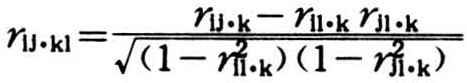m个变数中的特定两个变数,在其余(m-2)个变数都被固定时的线性相关系数。实际上变数都是不固定的,这里所说的固定是指应用统计方法消除其不固定的影响。偏相关系数以r附加右下标表示之,下标点后是被固定的变数。例如有x1、x2、x3三个变数,r12.3表示当x3变数被固定时,x1和x2两变数的偏相关系数。只固定一个变数的偏相关系数叫做一级偏相关系数,如r12.3、r13.2和r23.1。固定两个变数的偏相关系数叫做二级偏相关系数,如r12.34、r13.24、r14·23、r23.14、r24.13和r34.12。余可类推。一般而言,如有m个变数,可以计算出个(m-2)级偏相关系数。偏相关系数的计算公式为: