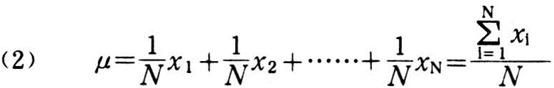 总体平均数μ是有限总体中各观察值x1(i=1,2,……,N)与其概率的乘积之和,见(2)式: