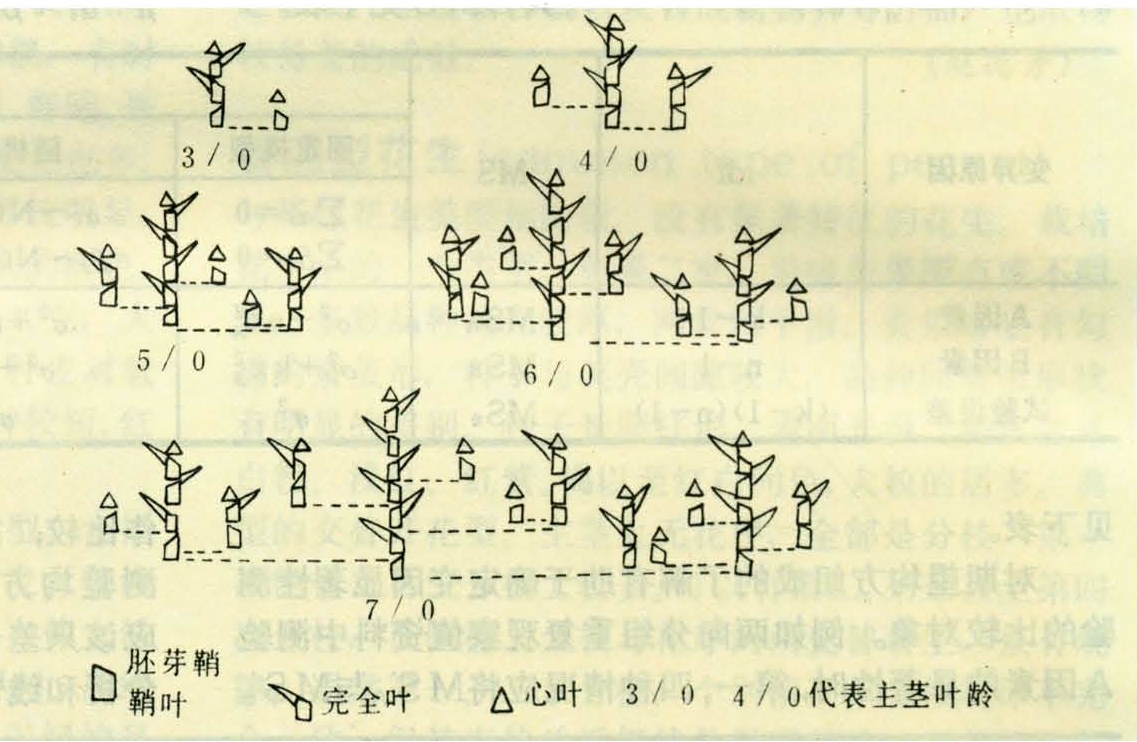 禾谷类作物的根、茎、叶以及主茎与分蘖同伸关系的研究资料甚多,稻麦的叶蘖同伸规律已基本清楚。以小麦为例,如图所示。当小麦幼苗主茎生出第三叶片时,由胚芽鞘中长出胚芽鞘分蘖的第一叶;当主茎生出第四叶片时,在主茎第一叶的叶腋生出分蘖第一叶,胚芽鞘分蘖生出第二叶;当主茎生出第五叶片时,胚芽鞘分蘖生出第三叶,第一分蘖生出第二叶,同时在主茎第二叶的叶腋中生出第二分蘖的第一叶;当主茎出现第六片叶时,在主茎第三叶的叶腋中生出分蘖的第一叶,此时第一叶的叶腋中的分蘖已生出第三叶,在其鞘叶的叶腋中又长出分蘖,是为二级分蘖。在分蘖期间,当主茎上每生出一片叶时,即沿主茎分蘖节位由下而上顺序长出各个分蘖,同时在各个分蘖上也相应地出生分蘖。根据上述叶蘖出生的次序,可以知道同一时期内同伸的叶蘖,同时依据主茎叶片数,可以推算当时应有的分蘖数。