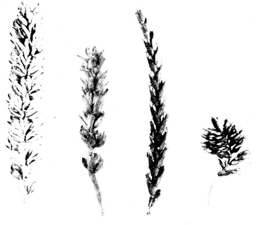 缺体的一个有利条件是可直接通过穗部性状和其他形态特征予以鉴别。部分同源群的缺体常有类似的表型,但同一部分群内不同缺体系间表现也是不一致的。如小麦第5部分同源群缺体的穗型,由于5A染色体上带有一个抑制斯卑尔脱穗型的显性Q基因,因此缺体5A独自表现为斯卑尔脱穗型:颖壳小、坚硬而稀松(见图1):仅5B与5D两缺体穗型彼此相类似,均比5A缺体穗短且密。然而,这部分同源群的三个缺体仍有一些共同特点:如均晚熟(其中缺体5D最晚熟),叶窄,茎细,颖壳和种子均小。