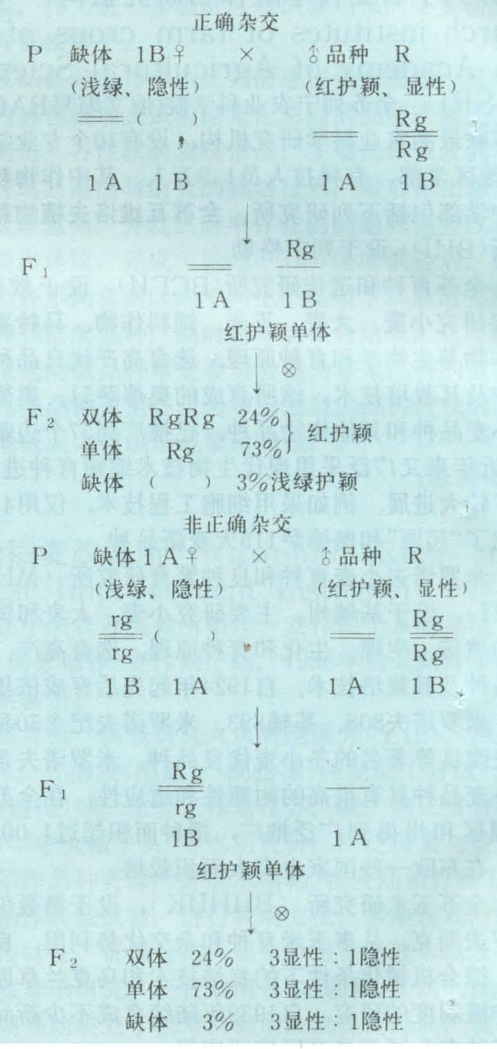 在基因定位中,缺体系也是通常利用的一种遗传材料,它比单体法更简便,仅以小麦红护颖显性基因定位为例(见图2),用缺体1B为母本与红护颖纯合显性品种杂交,F 1全部为单体呈红护颖显性穗型(因该单体都来自父本),自交产生F 2,约24%的双体和73%的单体(共97%的个体)均为红护颖穗型,仅约3%的缺体呈浅绿护颖。但在非正确杂交中,F 1也全部为红护颖穗型的单体,自交产生F2无论是双体、单体或缺体,它们的表型均以3显性∶1隐性分离,这与正确杂交不同,故可将显性红护颖基因定位在1B染色体上。