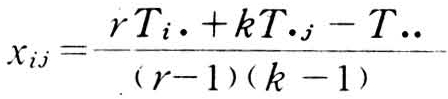 式中 xij=第i个区组、第j个处理数据的缺值计估值,r=区组数,k=处理数,Ti.=缺值所属区组总和(不包括缺值),T.j=缺值所属处理总和(不包括缺值),T..=全试验总和(不包括缺值)。