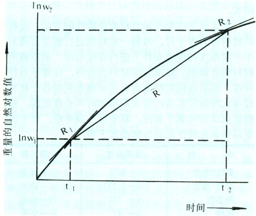 由上图看出相对生长率是lnw对时间关系的斜率。在实践中常是以两个时间间隔内的增重,求算平均相对生长率()的,因此从上式积分得到下式,用以计算一定时间内的相对增长率。