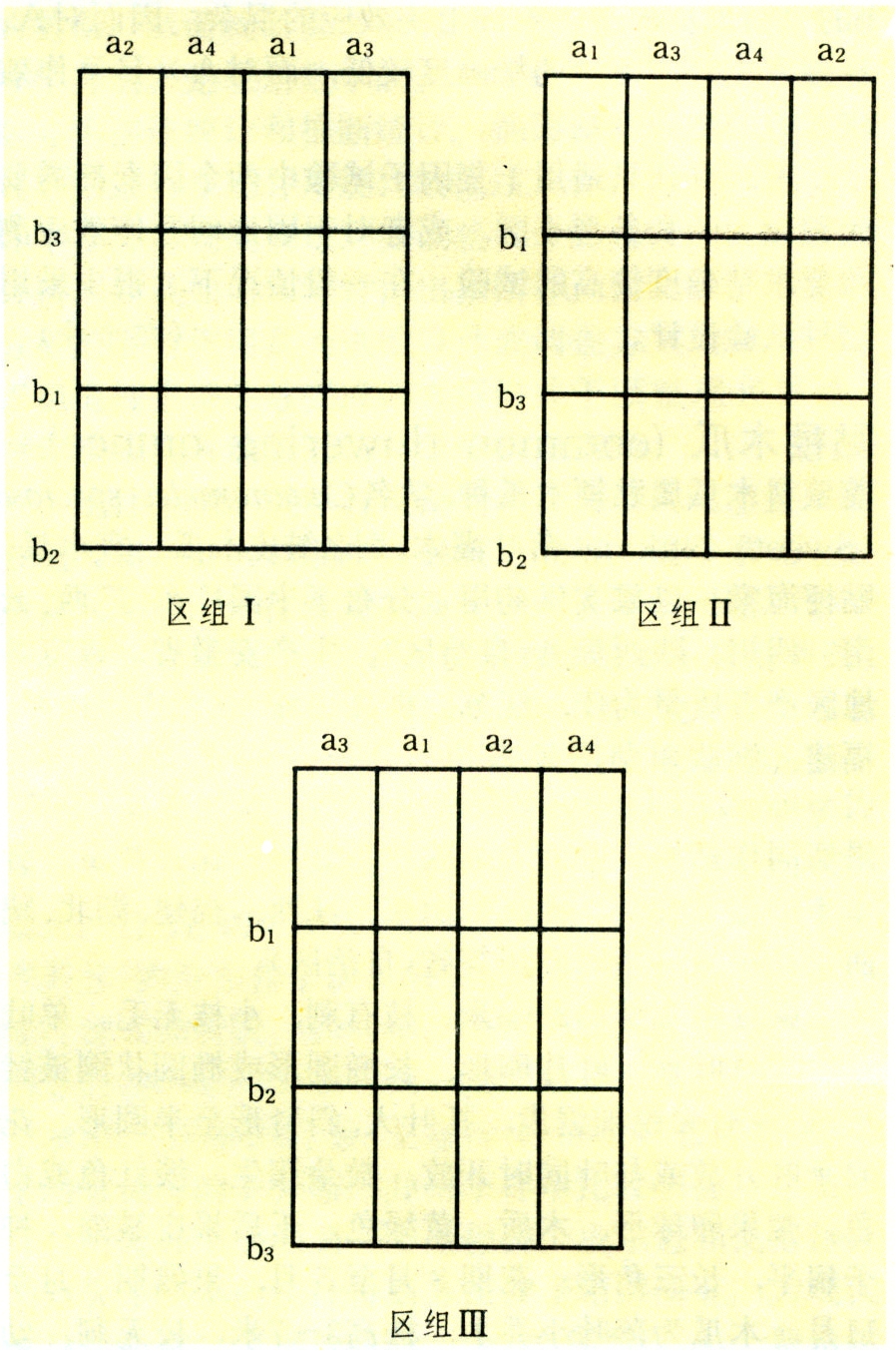 在每一区组的纵横两个方向分别安排两个试验因素的一种设计。如果试验的两个因素都要求较大的小区,而且,为了管理及观察方便,两个因素的小区都要求呈长条形时,可将每个区组先划分为若干纵向小区布置第一个因素(A)的各处理;再将该区组划分为若干横向小区,布置第二个因素(B)的各处理。这种设计是裂区设计的一种变型,这时纵横方向小区都是主区,两个因素的各处理组合小区才是副区。如A因素有4个处理(a1、a2、a3、a4),B因素有3个处理(b1、b2、b3),则三个重复的排列设计如下图所示。