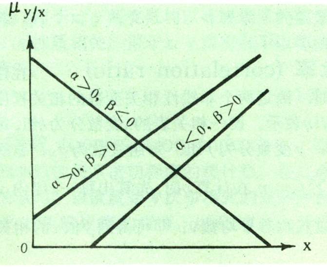 式中 α是x=0时y条件总体的平均数,亦即直线在y轴上的截距,称为总体回归截距。β是x每增加一个单位量时,y条件总体平均数μy/x将要增加(β>0)或减少(β<0)的单位量数,称为总体回归系数或斜率。下图绘出α和β不同取值时μy/x=α+βx在第Ⅰ象限的三种图象。