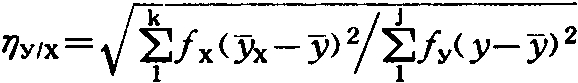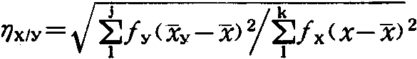 在用相关表计算时,测定两个非线性相关变数的相关程度的统计数,以η表示。设一相关表的x变数分为k组,每组次数为fx;y变数分为j组,每组次数为fy;总次数为。在计算η时先算出每一x组内y变数的平均数