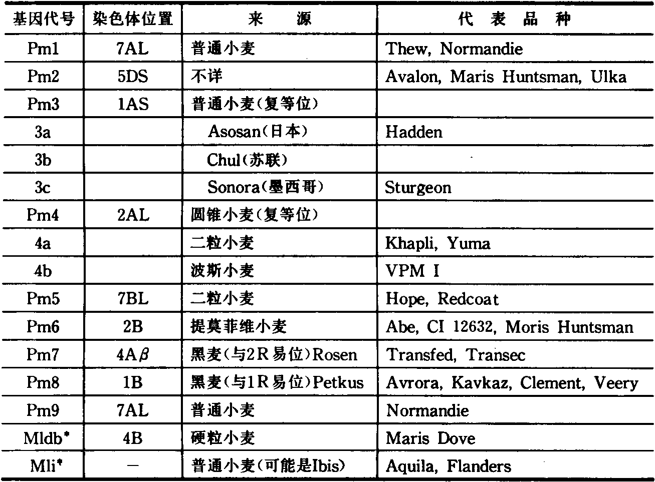 国际上已定名的白粉病抗源计有Pm1~Pm9等9个位点12个抗病基因(包括5个复等位基因)(见表)