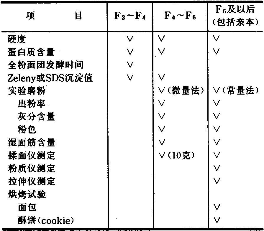籽粒硬度影响加工性能,可用小型硬度计(GT法)测定或用颗粒粗细指数(PSI)法和珠粒指数(PI)法测定,前者较为简便微量,后两种方法较为准确。硬质小麦麸皮与胚乳易于分离,出粉率高,面粉吸水多,面包发酵性能好,但磨粉耗能较多。软质小麦则相反。蛋白质含量是最基本的品质指标,采用近红外反射分光仪测定较为简便。全粉面团发酵时间(pelshenke)在一定程度上可以反映面筋质量,样品小,方法简便。沉淀值,不论是泽伦尼(Zeleny)法或SDS法测定,与面团特性、面包体积和面包评分均有较密切的相关,是目前早代品质测定中较常用的方法。有穗发芽为害的地区要特别注意加测α-淀粉酶活性,一般用降落值(FN)表示。也可在室内模拟人工降雨来筛选抗穗发芽材料。硬粒小麦用于制做通(实)心面,除参照上述项目进行有关测试外,必须测定硬度和叶黄素含量,还要做通(实)心面压制、烘干和煮面测定。